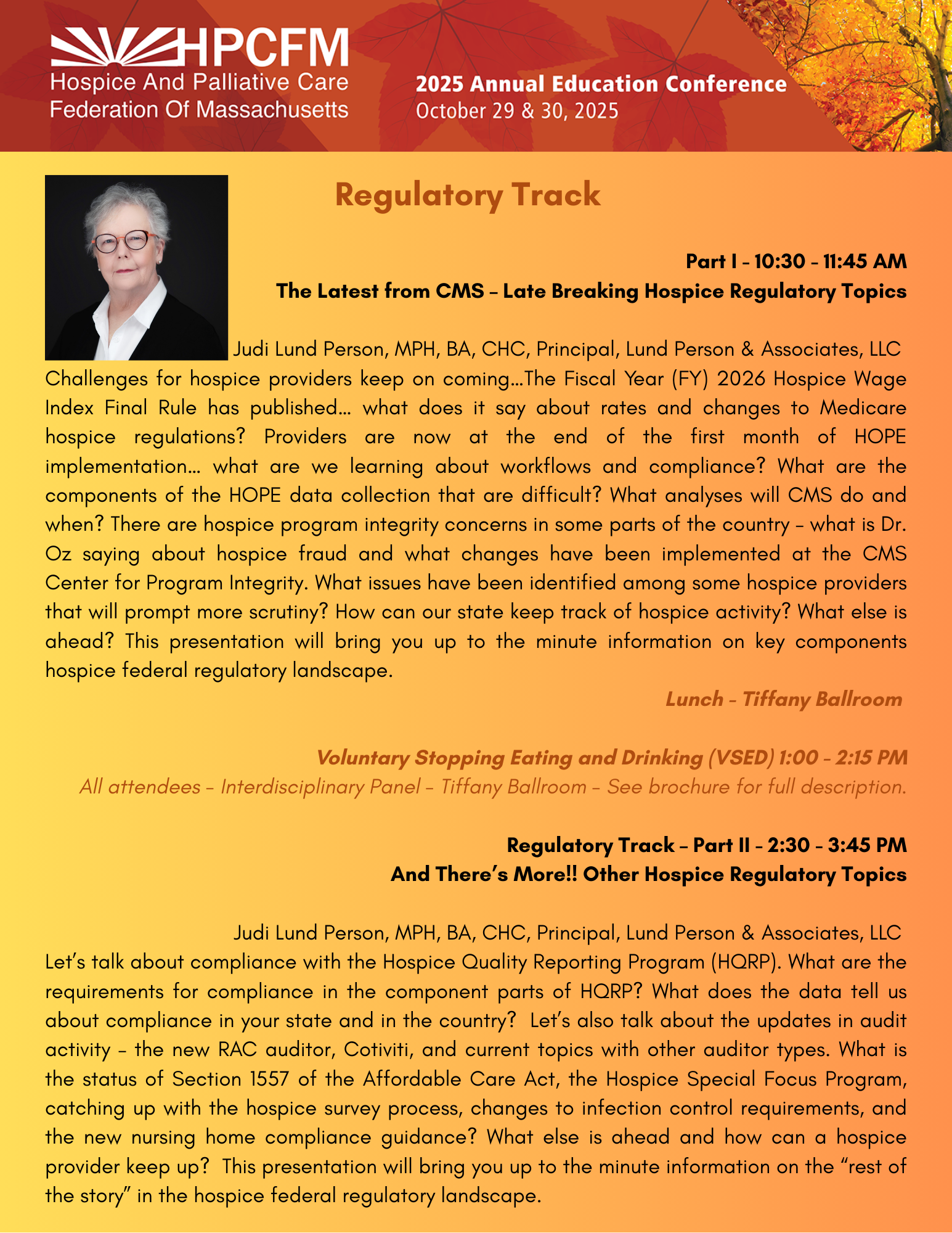 Scroll for all the details! Regulatory Track with Judi Lund Person Link Welcome Cocktail Hour - Wednesday, October 30, 2025